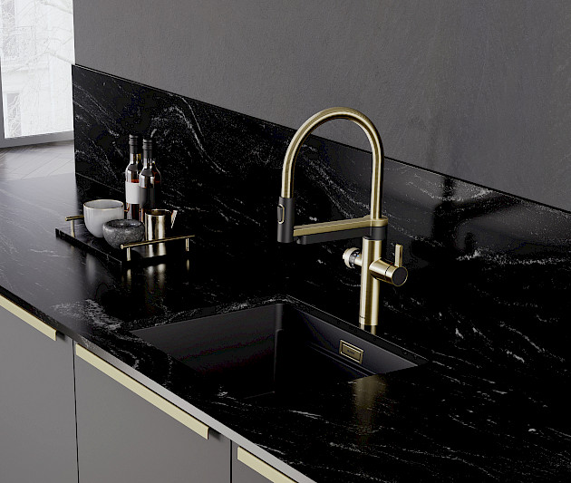 Mit BLANCO EVOL in satin gold gelingt das perfekte Matching von Armaturen und Wassersystemen mit Spülen und Becken aus Silgranit®. Küchenplaner und Küchendesigner profitieren von den vielen neuen Kombinationsmöglichkeiten. Sehr luxuriös präsentieren sich BLANCO UNITs in satin gold beispielsweise im feinen Kontrast zum eleganten Schwarz, Grau oder Weiß von Silgranit®-Oberflächen. Dazu ausgewählte Küchen-Komponenten, wie etwa ein eleganter Spülmittelspender im feinen Goldton und schon gewinnen Küchen eindrucksvoll an Ausstrahlung. BLANCO satin gold kann aber nicht nur Luxus, auch zu modernem Country- und Landhausstil passen Armaturen und Wassersysteme im brillanten Trendfarbton ausgezeichnet.