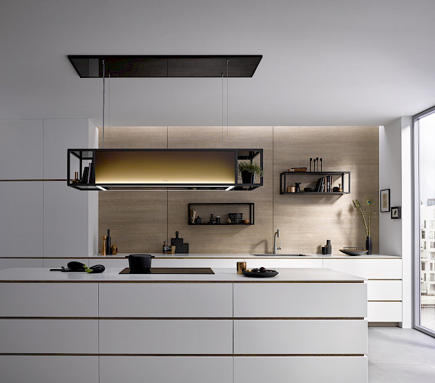Angelehnt an den modernen Industrielook zeigt die neue Skyline Frame Profil. Veredelt durch einen schmalen, mattschwarzen Rahmen aus Quadratrohr, begeistert die neue Deckenlifthaube mit urbanem Flair und modernem Loftcharakter. Ein besonderer Clou sind die praktischen, seitlich angeschlossenen Regalflächen. Hier finden Gewürze, Öle und Essig ihren Platz. In einer zweiten attraktiven Variante ist die Skyline Frame auch ohne Regalelemente erhältlich.
